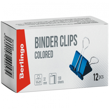 Металлические зажимы для бумаг Berlingo размером 32 мм с цветным покрытием. Могут скреплять до 150 листов плотностью 80 г/кв.м, не деформируя при этом бумагу. Поставляются в упаковке из картона по 12 штук (по три штуки каждого цвета).