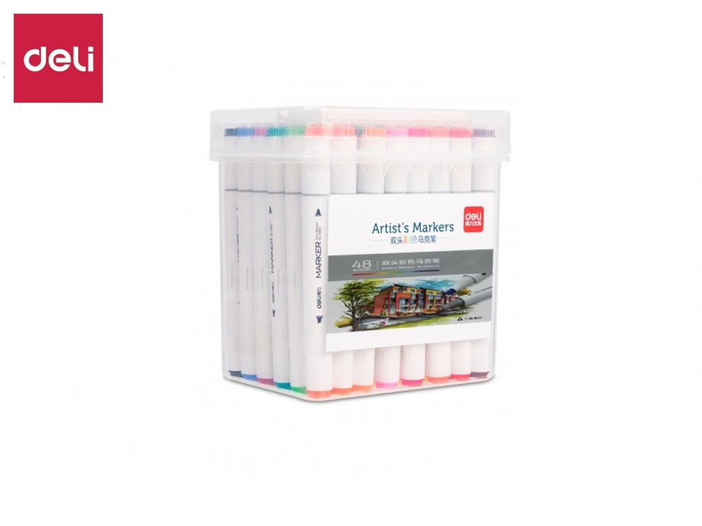 Набор маркеров для скетчинга Deli в прозрачном пластиковом кейсе. Проффесиональное качество. Яркие, стойкие цвета, плавные переходы при смешивании. Удобный треугольный корпус. Двусторонние. С одной стороны пулевидный наконечник - 1 мм, на другой - скошенный - 3-6 мм. На крышках, имеется обозначение цвета и его название. Строгий контроль качества и безопасности при производсте. В наборе 48 цветов.
