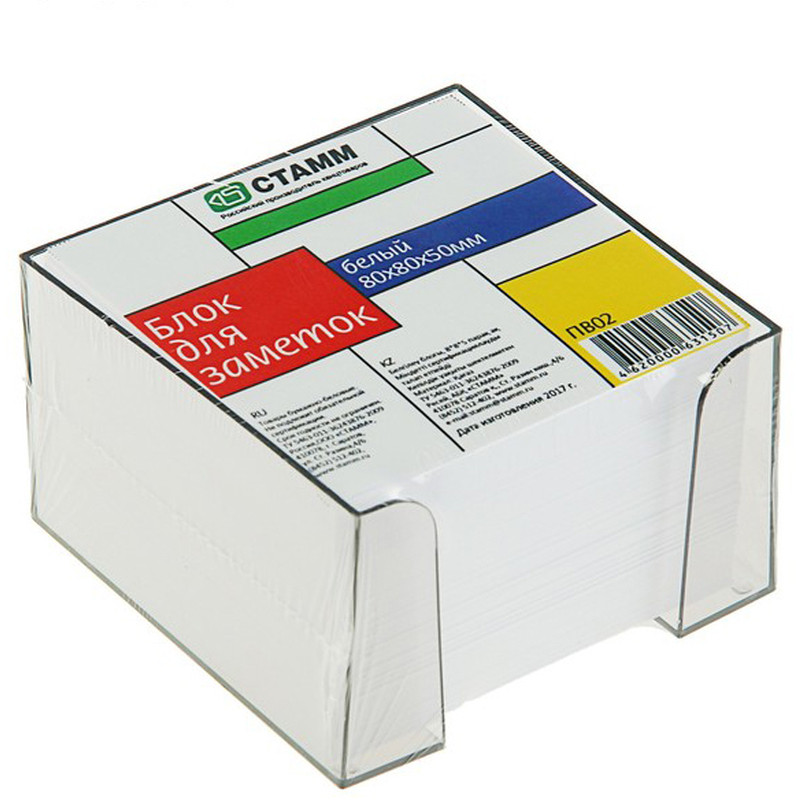 Блок белой бумаги для записей в прозрачной пластиковой подставке. Качественная белая бумага плотностью 80 г/м2. Размер листков 8 х 8 см.